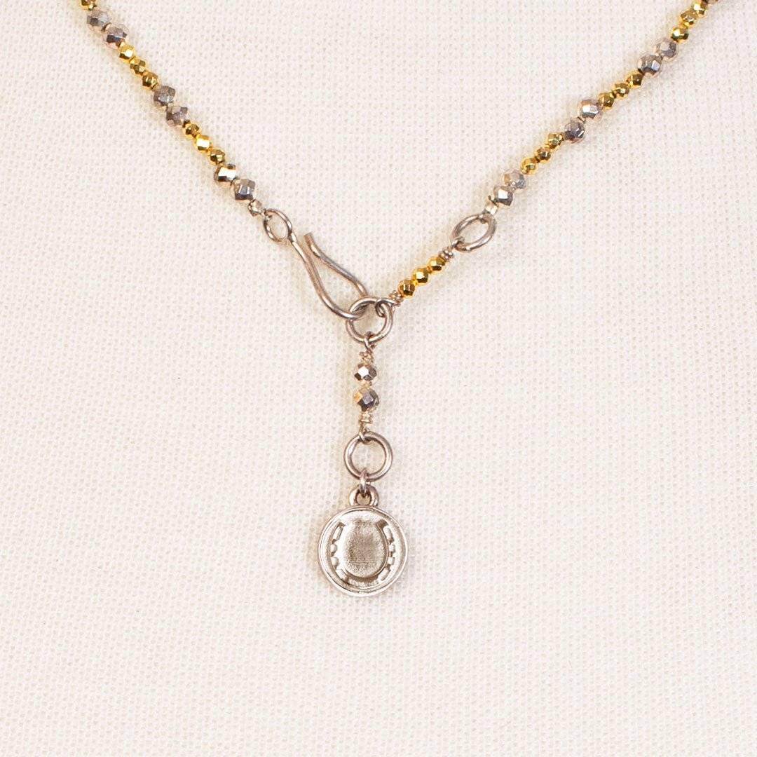 The Aurora Pyrite Long Strand Necklace plated in Silver and Gold by URBAN-EQUESTRIAN glows with modern elegance and equestrian spirit. Hand-strung pyrite beads, known as the “stone of protection and prosperity,” shimmer with dual metallic tones, symbolizing strength and abundance. A radiant double-sided horseshoe coin pendant adds heritage and luck. Designed to layer, double, or wear long, this versatile strand is striking equestrian jewelry, a chic horse girl accessory, and a powerful horse lover gift.