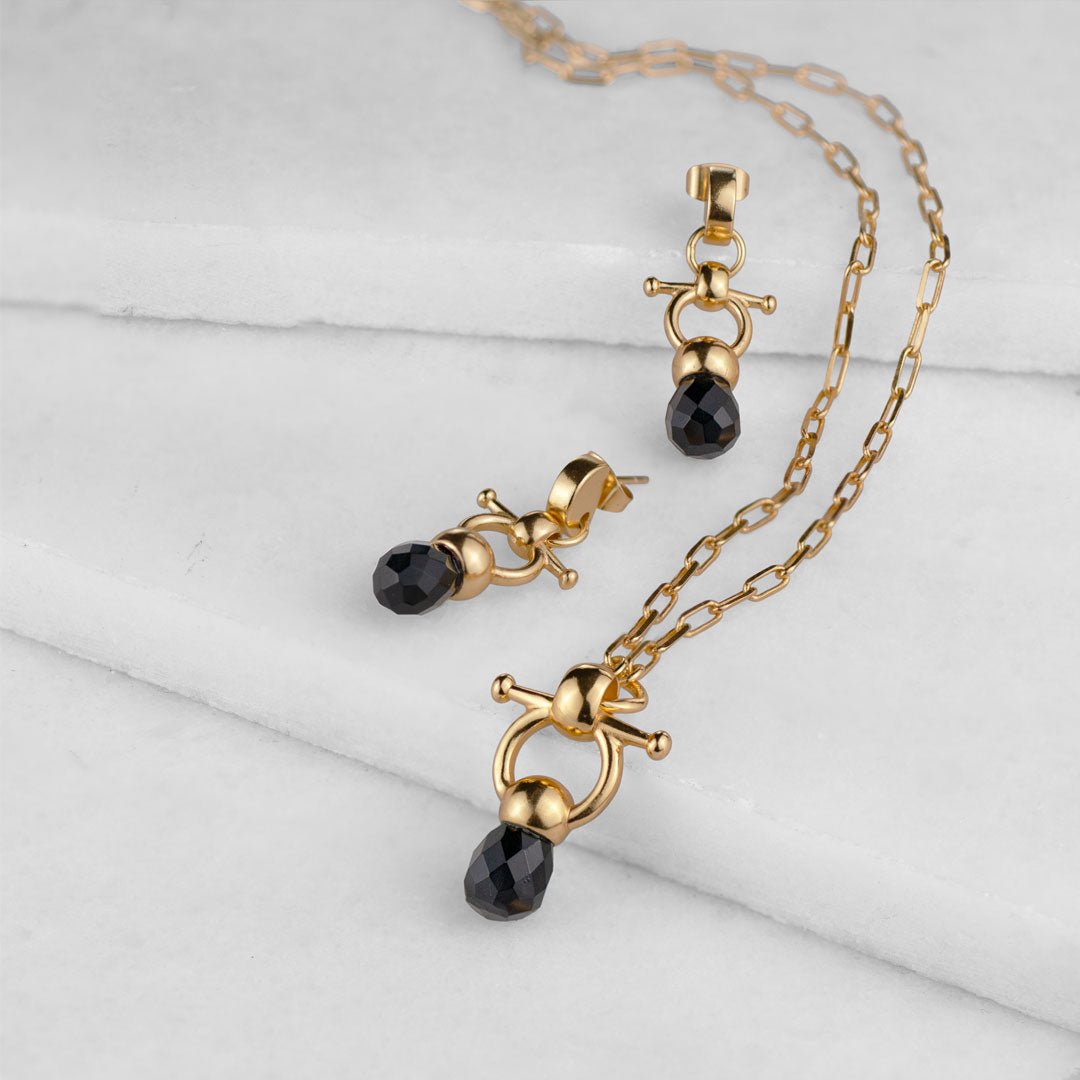 The Briolette Horse Bit Earrings by URBAN-EQUESTRIAN feature bold black onyx, celebrated for strength, grounding, and protection, encased in a sculpted full cheek snaffle bit design. Crafted in 14K gold over sterling silver, these statement earrings blend power with polish for elevated horse bit jewelry. A striking balance of equestrian jewelry and chic horse girl style, they make stunning horse lover gifts and timeless equestrian accessories with EQ sophistication.