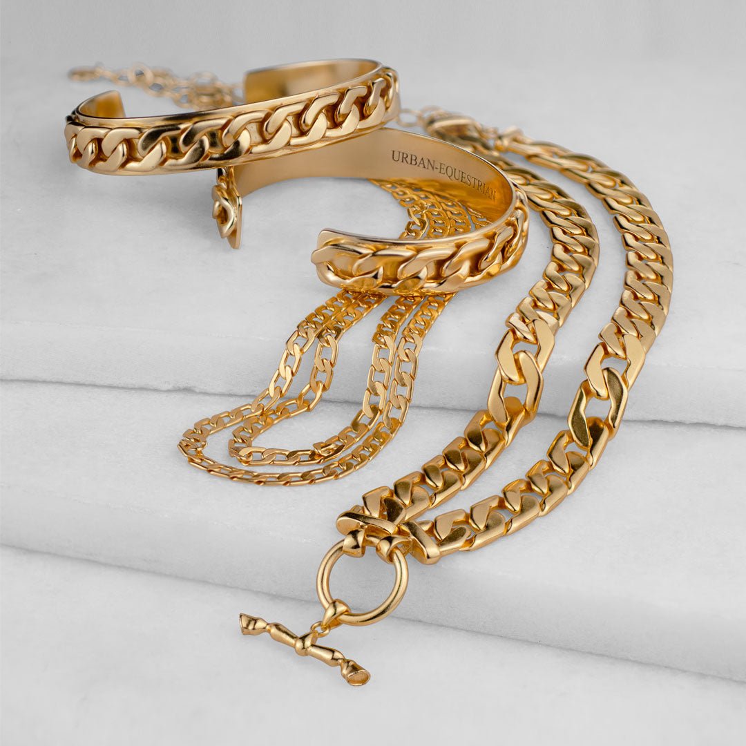 Cadence – Equestrian Curb Chain T-Bar Necklace in Gold by URBAN-EQUESTRIAN embodies modern equestrian elegance with bold curb chain design and polished gold finish. Inspired by classic tack, this statement necklace features a sculptural T-bar toggle closure for effortless wear. Designed to layer or stand alone, it’s a luxury equestrian jewelry piece and an elevated horse lover gift—perfect for horse girls and fashionistas alike.