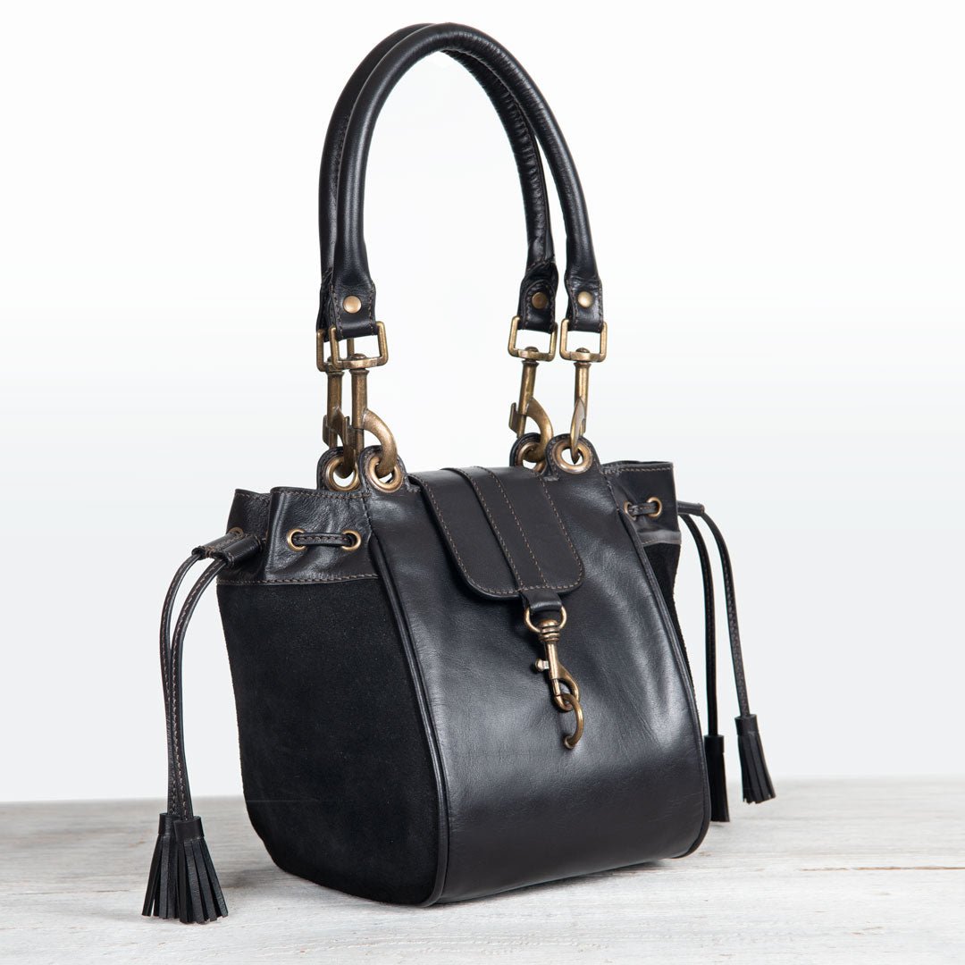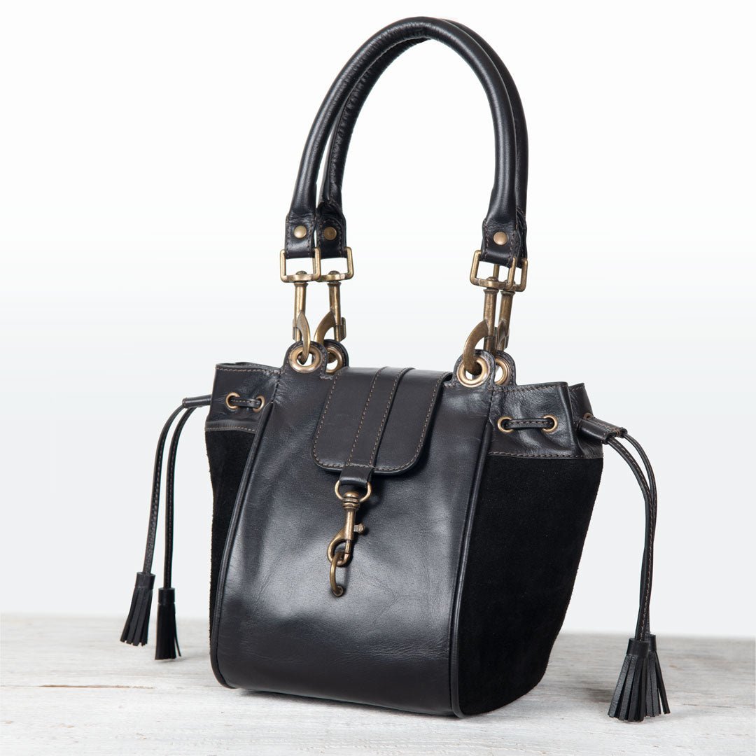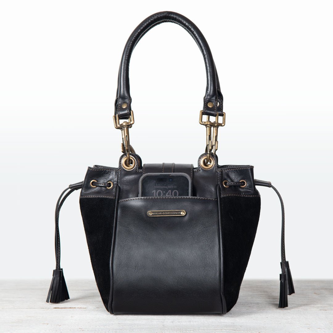 From Reins to Red Carpet, the Cassidy bucket bag exudes modern equestrian elegance in black Italian leather and suede. Accented with polished brass hardware, its tonal textures and sculpted form create a look that’s both sophisticated and bold. Designed for effortless transitions from stable to city, this timeless equestrian handbag is the perfect horse lover gift—a statement of sleek luxury and craftsmanship by URBAN-EQUESTRIAN.