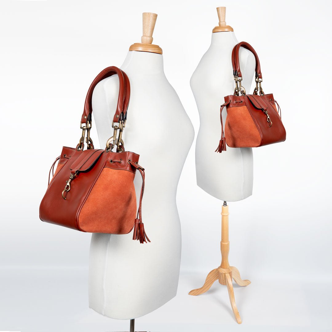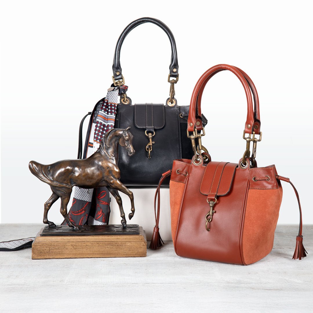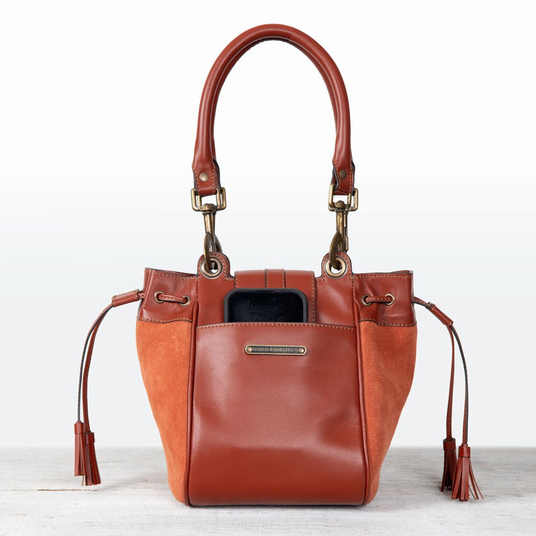 From Reins to Red Carpet, the Cassidy bucket bag captures equestrian elegance in two-tone cognac suede and Italian leather. Polished brass hardware adds a refined glow to its sophisticated silhouette, blending texture, tone, and timeless craftsmanship. Designed for effortless transitions from stable to city, this is the ultimate equestrian handbag and luxurious horse lover gift — a statement of modern style and elegance by URBAN-EQUESTRIAN.
