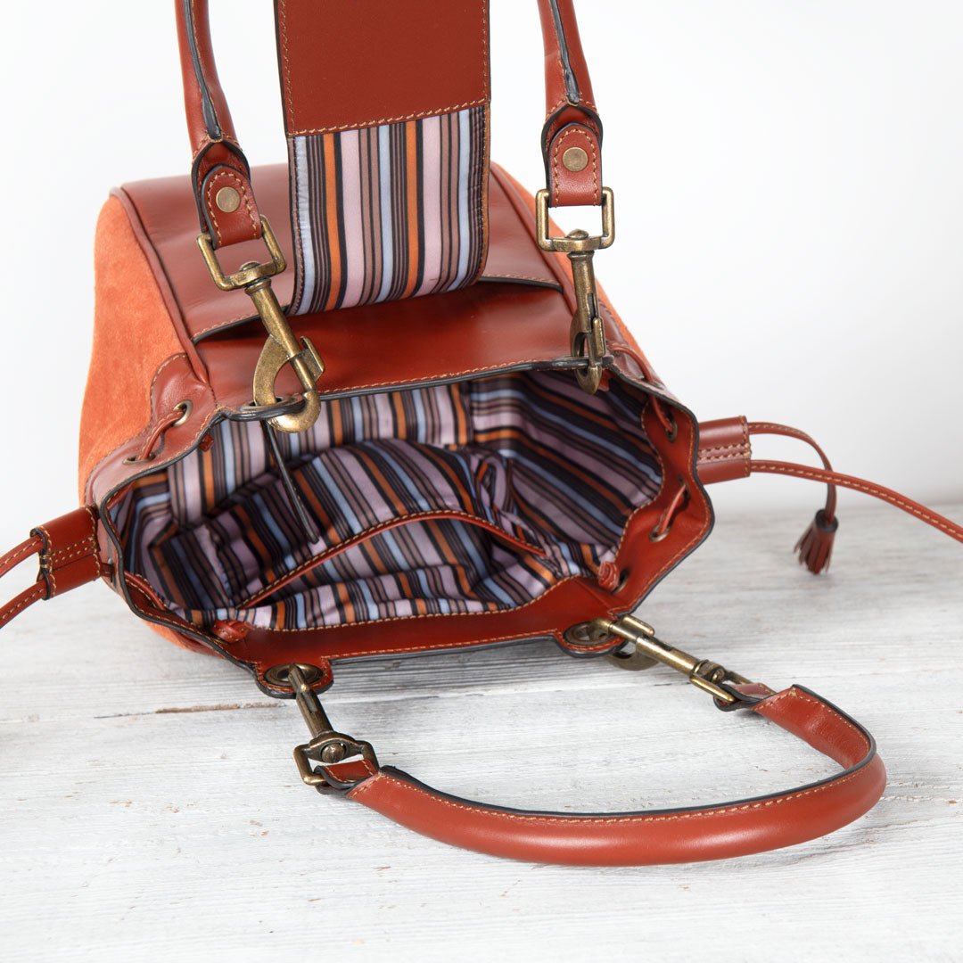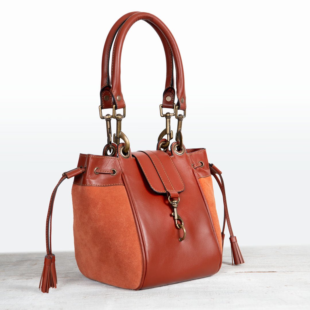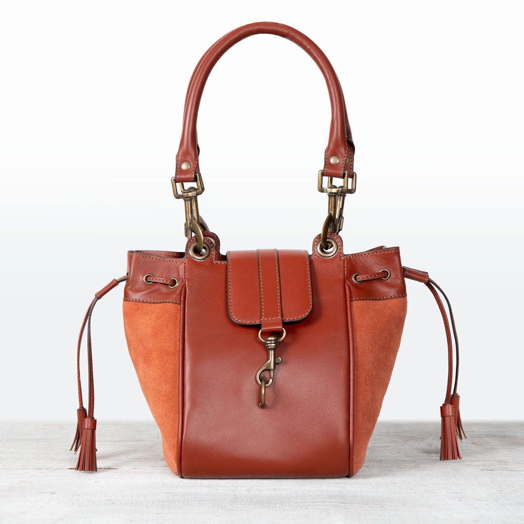 From Reins to Red Carpet, the Cassidy bucket bag captures equestrian elegance in two-tone cognac suede and Italian leather. Polished brass hardware adds a refined glow to its sophisticated silhouette, blending texture, tone, and timeless craftsmanship. Designed for effortless transitions from stable to city, this is the ultimate equestrian handbag and luxurious horse lover gift — a statement of modern style and elegance by URBAN-EQUESTRIAN.