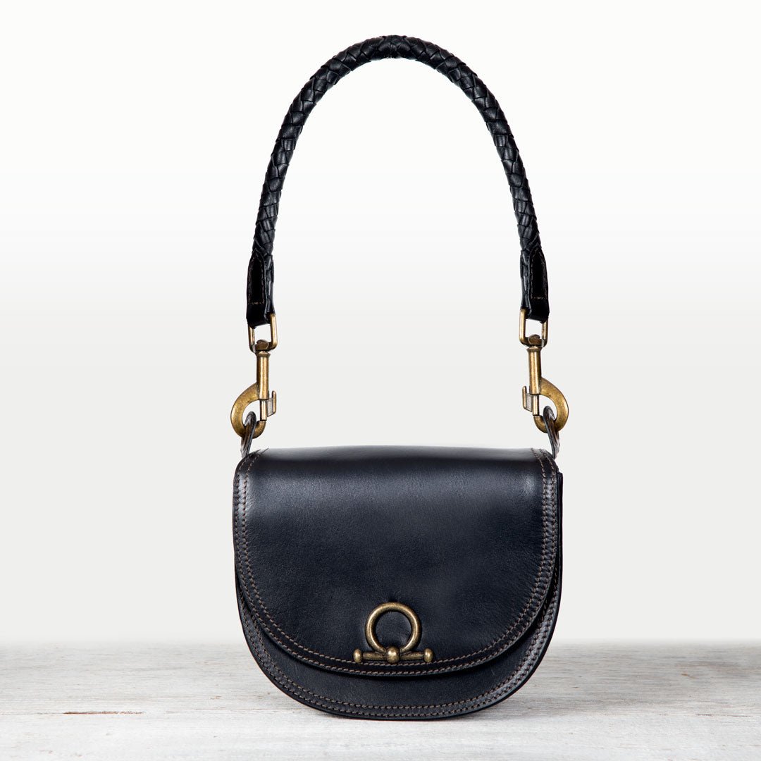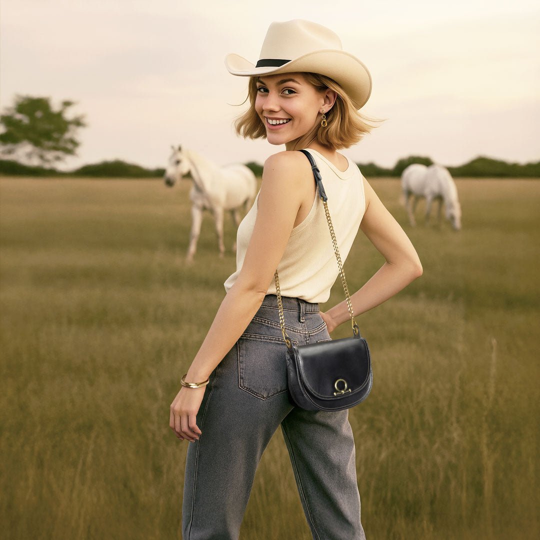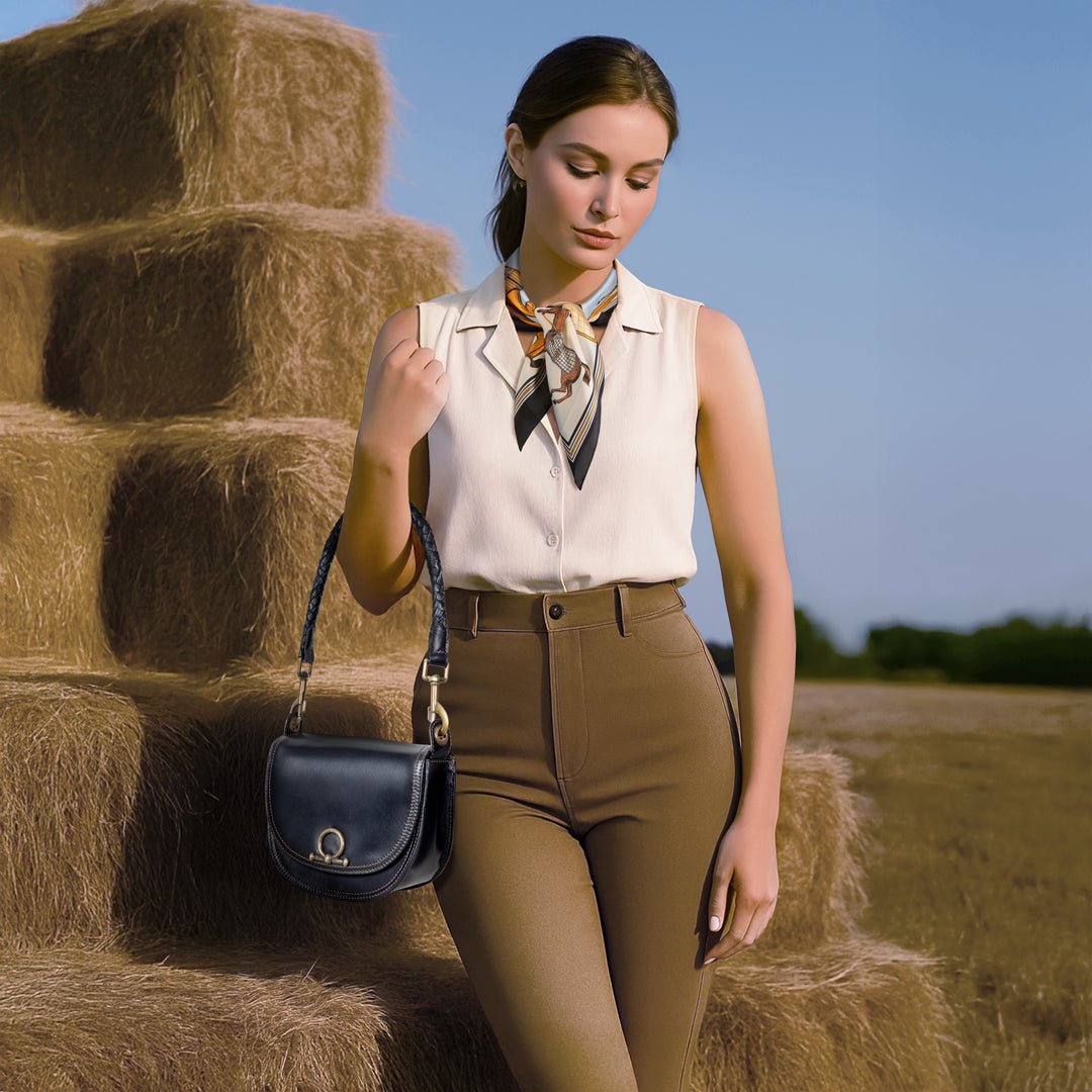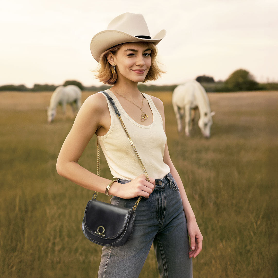 From rodeo to runway, the Cortina Horse Bit Lock Crossbody blends timeless equestrian heritage with modern polish. Crafted in sleek black Italian leather, this refined silhouette features a signature horse bit lock and warm brass hardware. Finished with a hand-woven designer top handle and a fashion curb chain & leather shoulder strap, it’s a luxury equestrian handbag and a standout horse lover gift. Designed by URBAN-EQUESTRIAN.