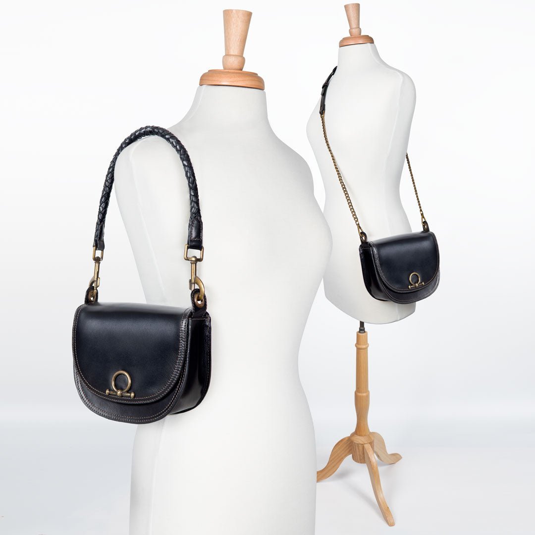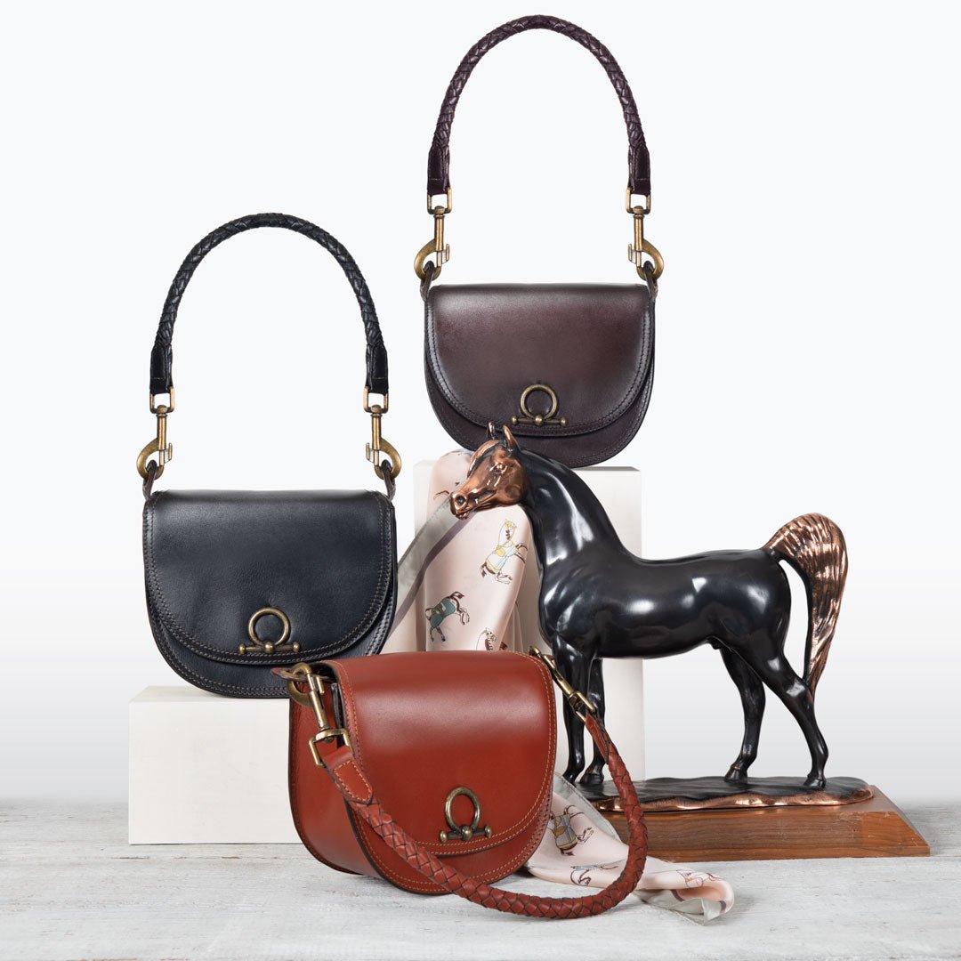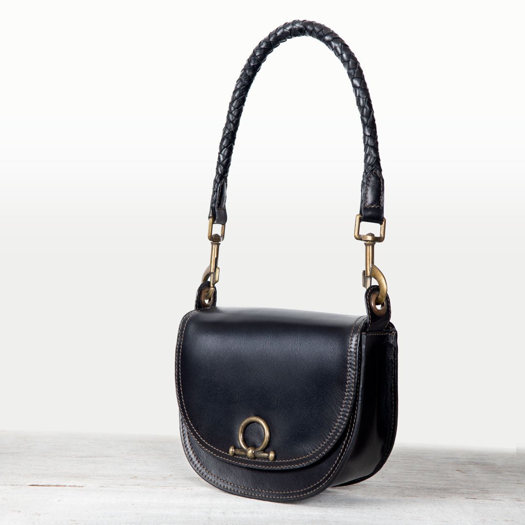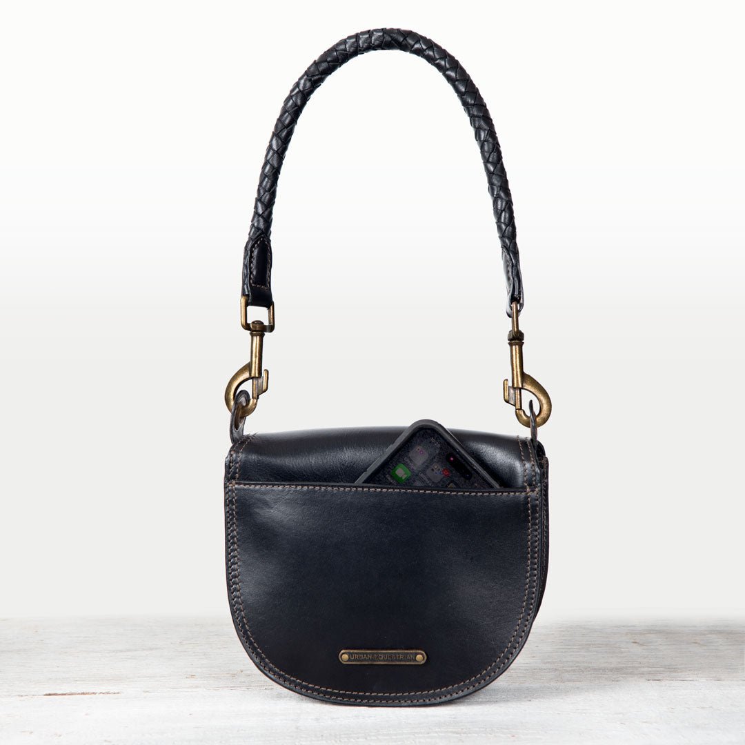 From rodeo to runway, the Cortina Horse Bit Lock Crossbody blends timeless equestrian heritage with modern polish. Crafted in sleek black Italian leather, this refined silhouette features a signature horse bit lock and warm brass hardware. Finished with a hand-woven designer top handle and a fashion curb chain & leather shoulder strap, it’s a luxury equestrian handbag and a standout horse lover gift. Designed by URBAN-EQUESTRIAN.