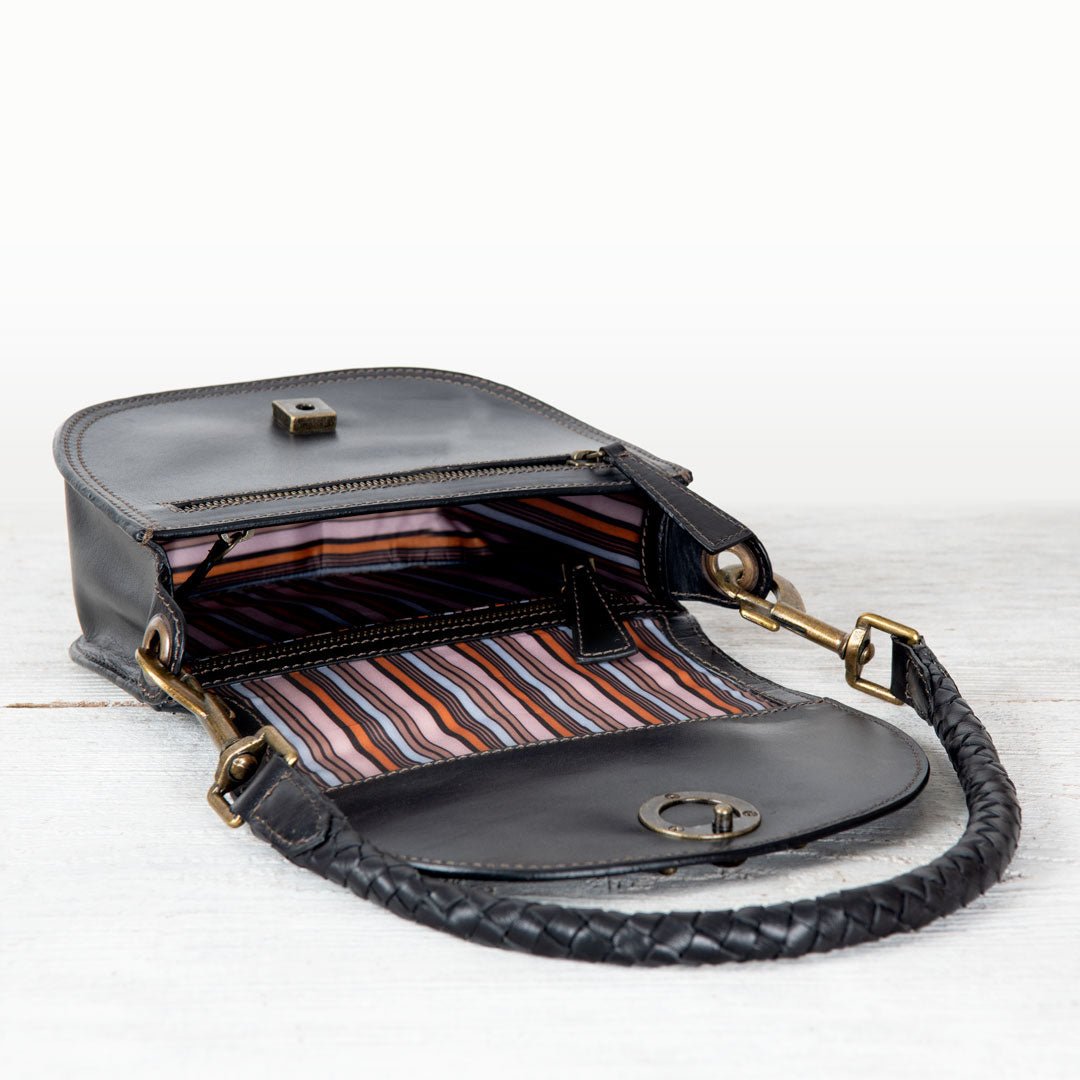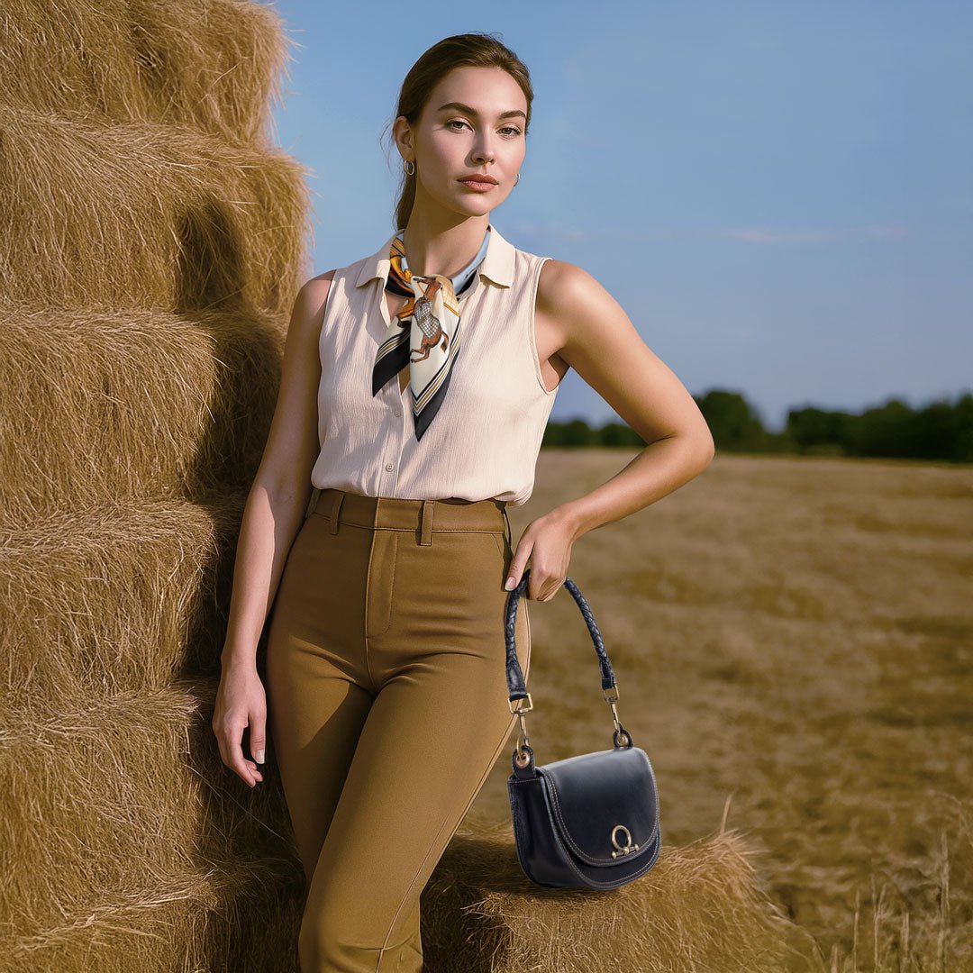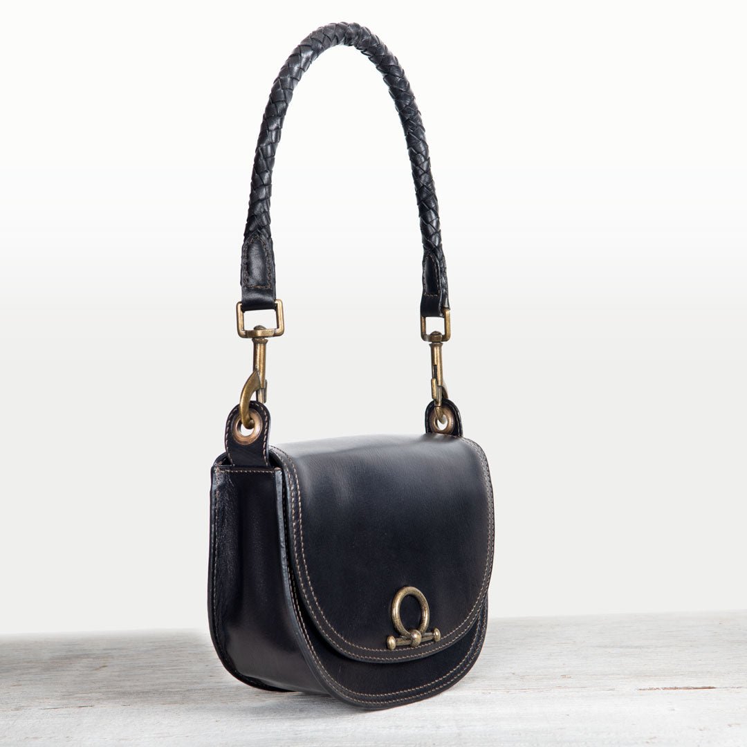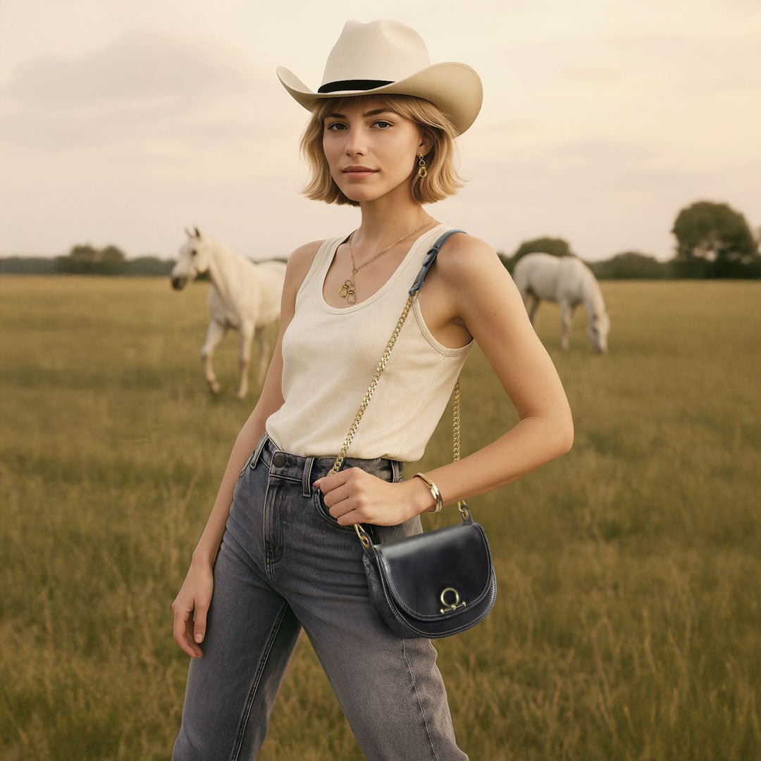 From rodeo to runway, the Cortina Horse Bit Lock Crossbody blends timeless equestrian heritage with modern polish. Crafted in sleek black Italian leather, this refined silhouette features a signature horse bit lock and warm brass hardware. Finished with a hand-woven designer top handle and a fashion curb chain & leather shoulder strap, it’s a luxury equestrian handbag and a standout horse lover gift. Designed by URBAN-EQUESTRIAN.