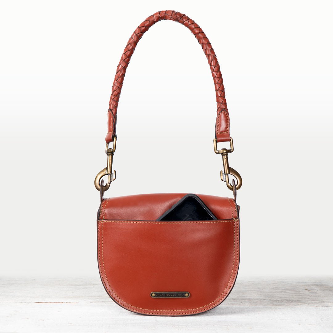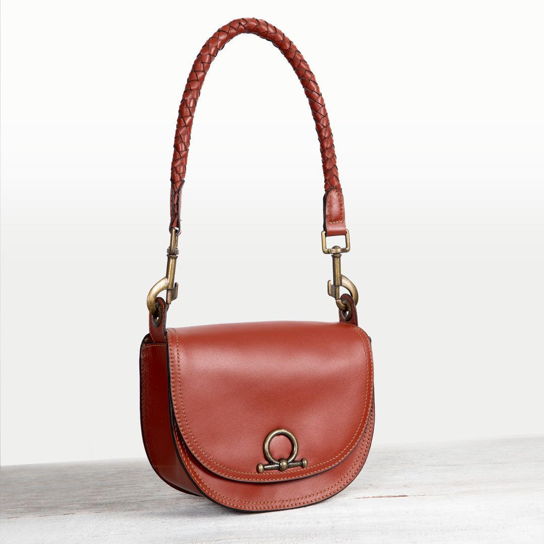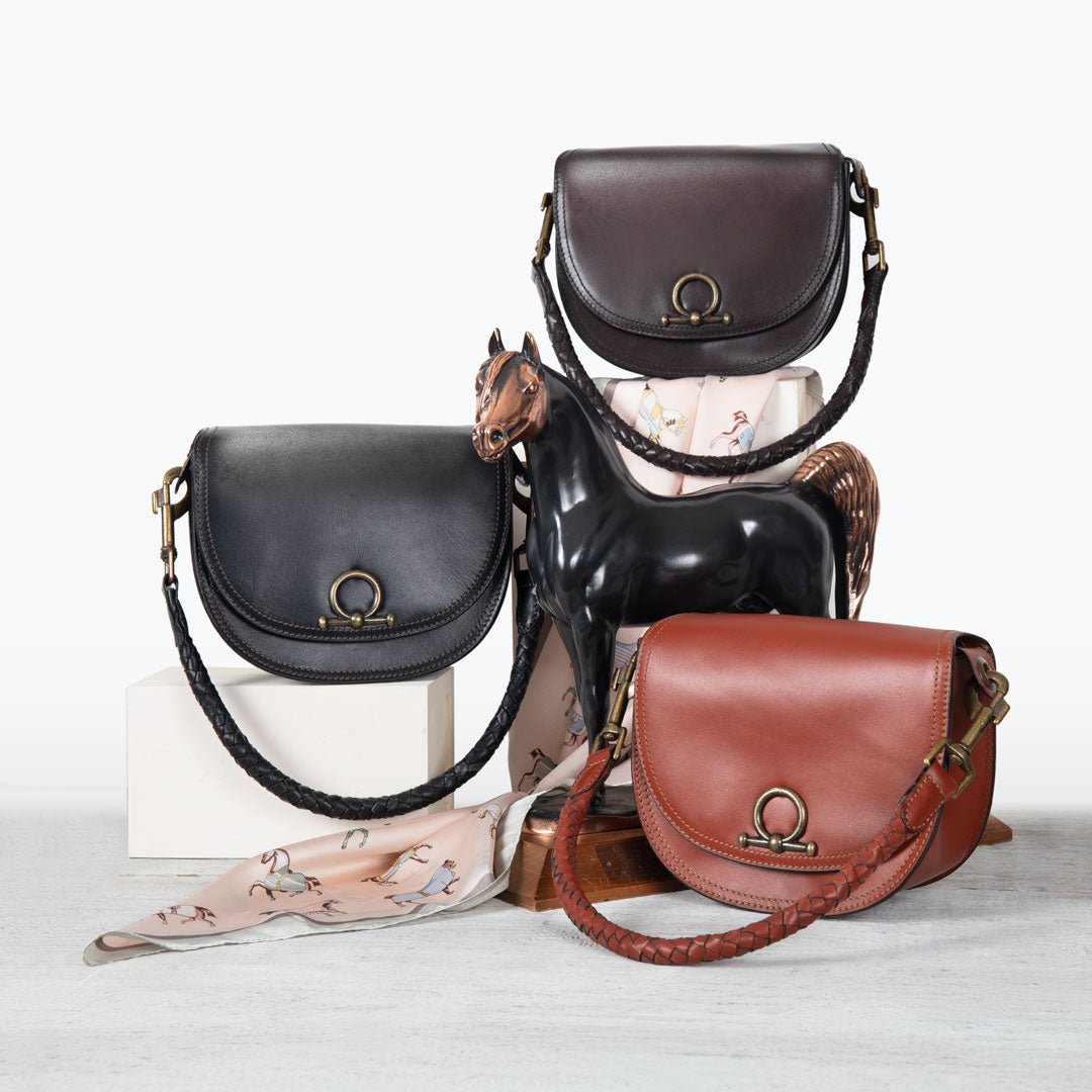 From saddle to soirée, the Cortina Horse Bit Lock Crossbody blends timeless equestrian heritage with modern polish. Crafted in rich cognac Italian leather, this refined silhouette features a signature horse bit lock and warm brass hardware. Finished with a hand-woven designer top handle and a fashion curb chain & leather shoulder strap, it’s a luxury equestrian handbag and a standout horse lover gift. Designed by URBAN-EQUESTRIAN.