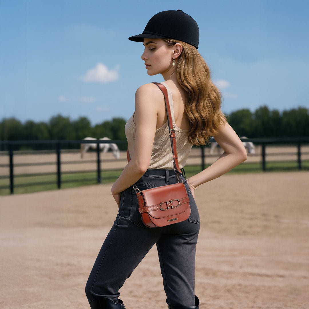 From Saddle to Soirée, the Delaney Riding Stirrup Handbag by URBAN-EQUESTRIAN embodies bold equestrian style with modern sophistication. Handcrafted in smooth cognac Italian leather, it features a polished double riding stirrup flap for signature EQ flair. A wide shoulder strap ensures comfortable wear, while the water resistant taffeta lining, flap closure, and structured silhouette bring refined functionality. A standout luxury equestrian handbag, Delaney is a chic horse girl bag and timeless horse lover gift.
