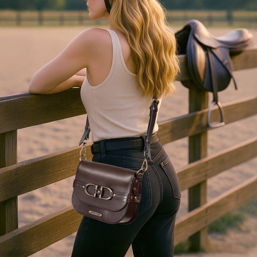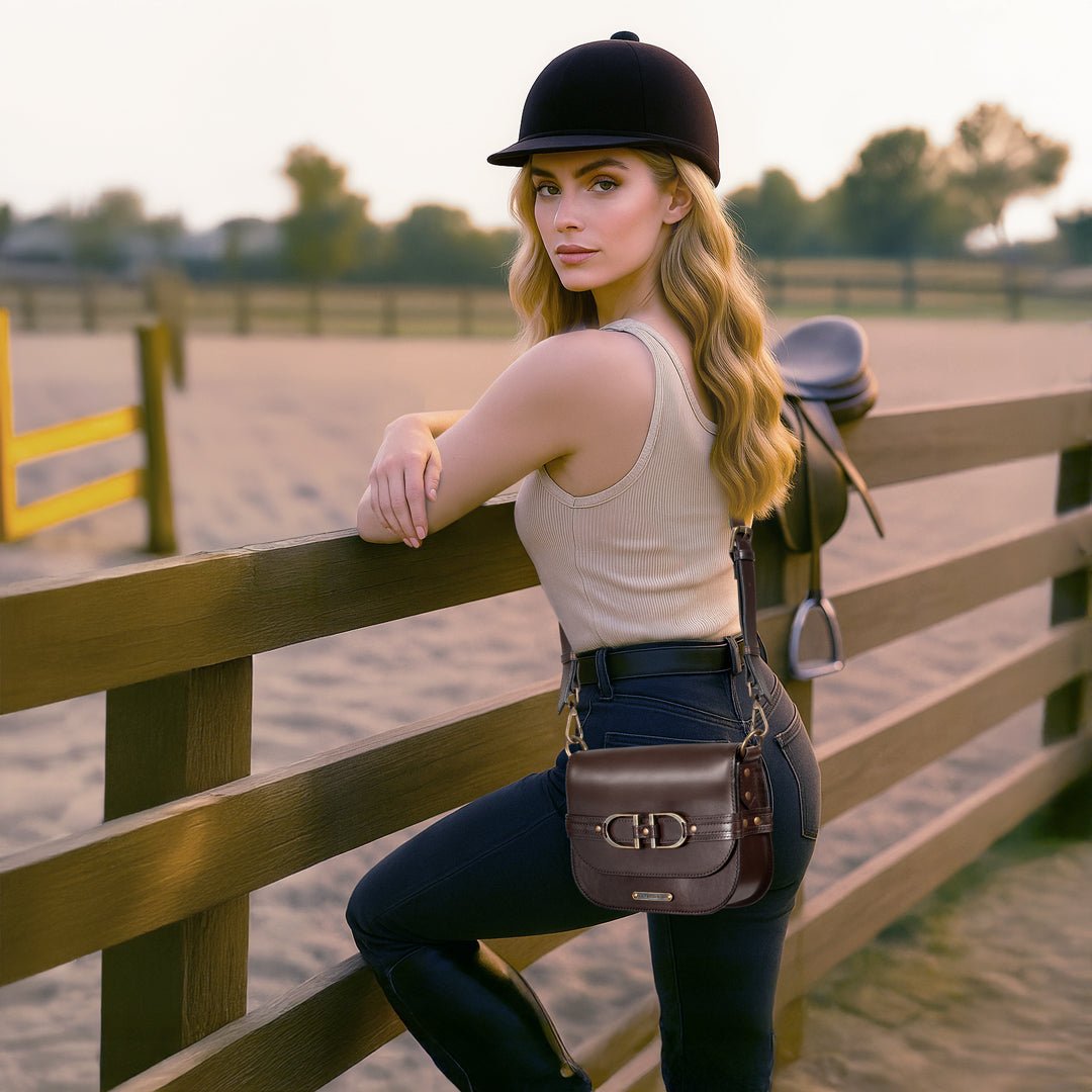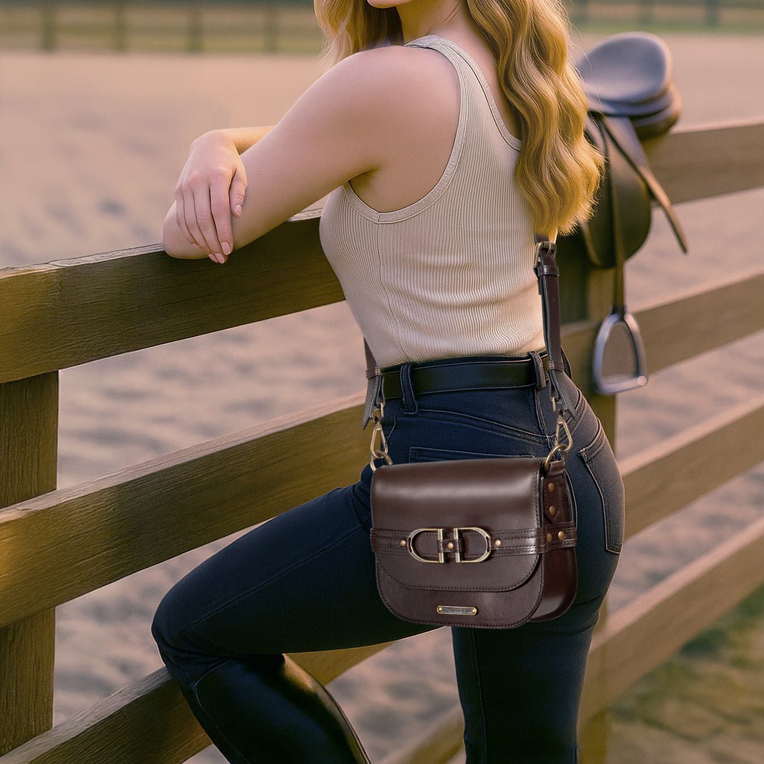 From Saddle to Soirée, the Delaney Riding Stirrup Handbag by URBAN-EQUESTRIAN makes a striking statement in deep brown Italian leather. Its polished double stirrup hardware adds equestrian edge, while the wide shoulder strap delivers effortless comfort. Designed with a secure flap closure and lined in water resistant taffeta, the Delaney offers a balance of refinement and function. A versatile luxury equestrian accessory, it’s a sophisticated horse girl bag and an unforgettable horse lover gift.