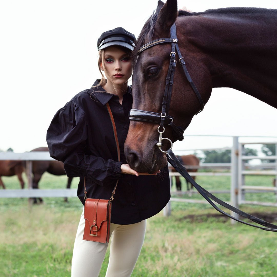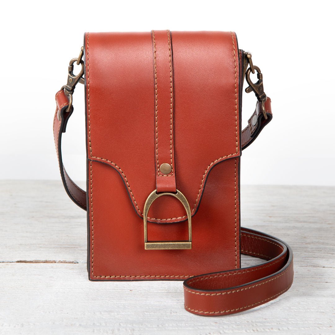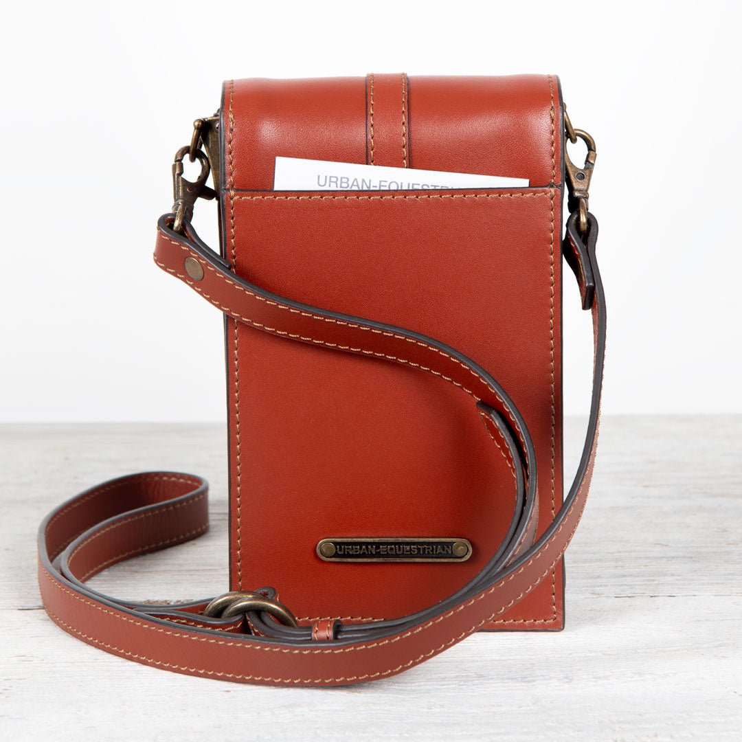 From Stable to Soirée, the Devon Deluxe Horse Stirrup Leather Phone Bag in Cognac by URBAN-EQUESTRIAN exudes classic equestrian sophistication. Handcrafted in rich cognac Italian leather and accented with a polished stirrup detail, this sleek crossbody combines elegance with function. Inside, a reimagined interior offers an extra sleeve, center zip pouch, and card slots for perfect organization, while a magnetic snap closure and back sleeve pocket keep essentials secure. A timeless equestrian leather phone bag and the perfect horse lover gift.