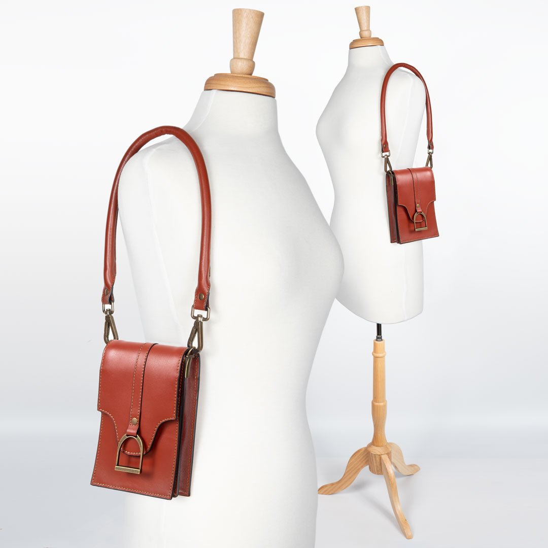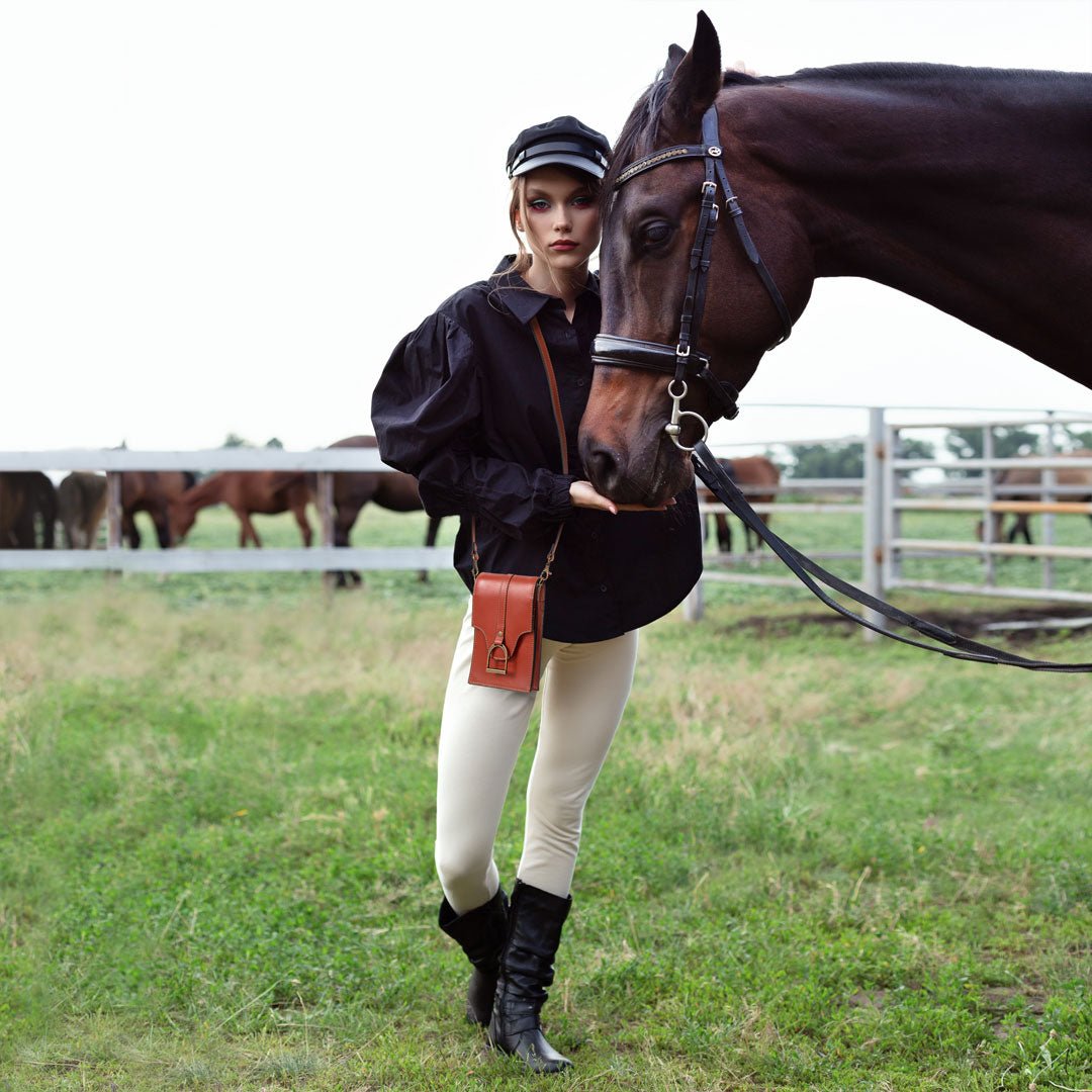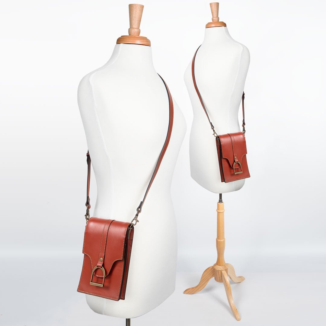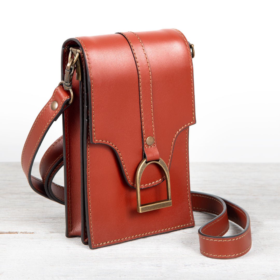 From Stable to Soirée, the Devon Deluxe Horse Stirrup Leather Phone Bag in Cognac by URBAN-EQUESTRIAN exudes classic equestrian sophistication. Handcrafted in rich cognac Italian leather and accented with a polished stirrup detail, this sleek crossbody combines elegance with function. Inside, a reimagined interior offers an extra sleeve, center zip pouch, and card slots for perfect organization, while a magnetic snap closure and back sleeve pocket keep essentials secure. A timeless equestrian leather phone bag and the perfect horse lover gift.