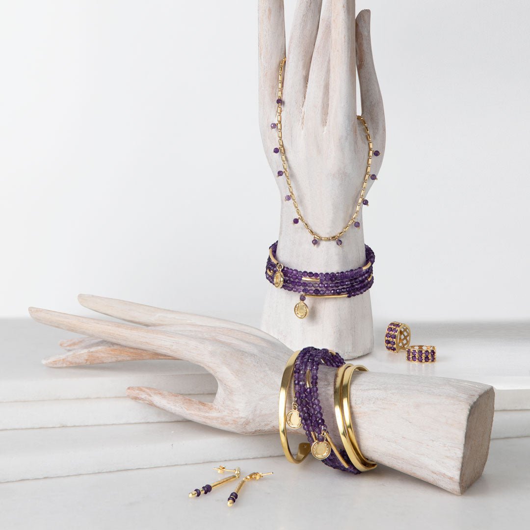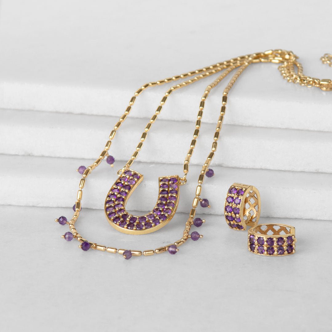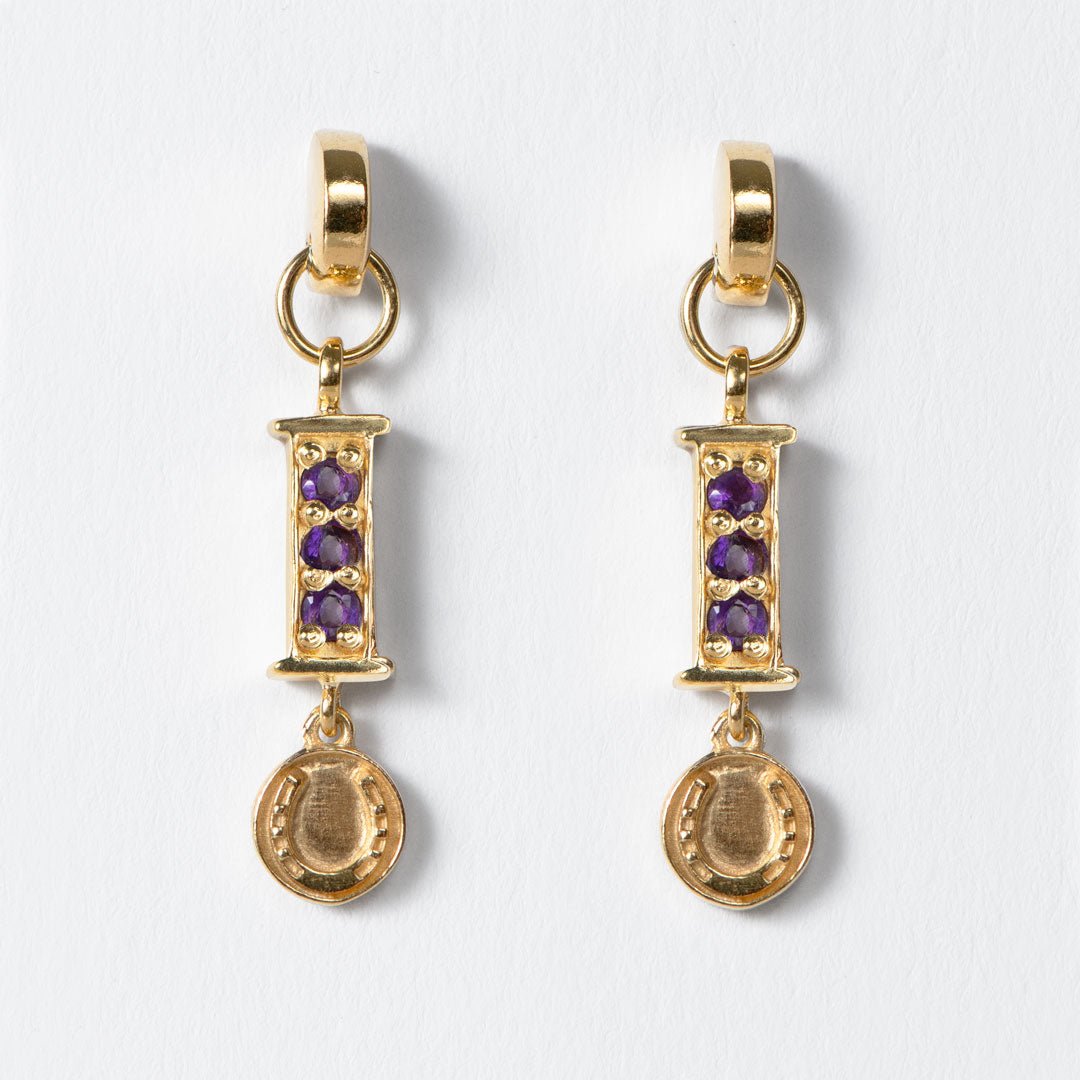 The Prism Amethyst Horseshoe Coin Earrings by URBAN-EQUESTRIAN bring gemstone elegance to classic equestrian jewelry. Amethyst, treasured for balance, calm, and spiritual clarity, glows with violet brilliance in radiant coin drops framed by iconic horseshoe detail. Lightweight yet striking, these horseshoe earrings add refined sparkle from Gallop to Gala! A chic horse girl accessory and meaningful horse lover gift for everyday or soirée style.