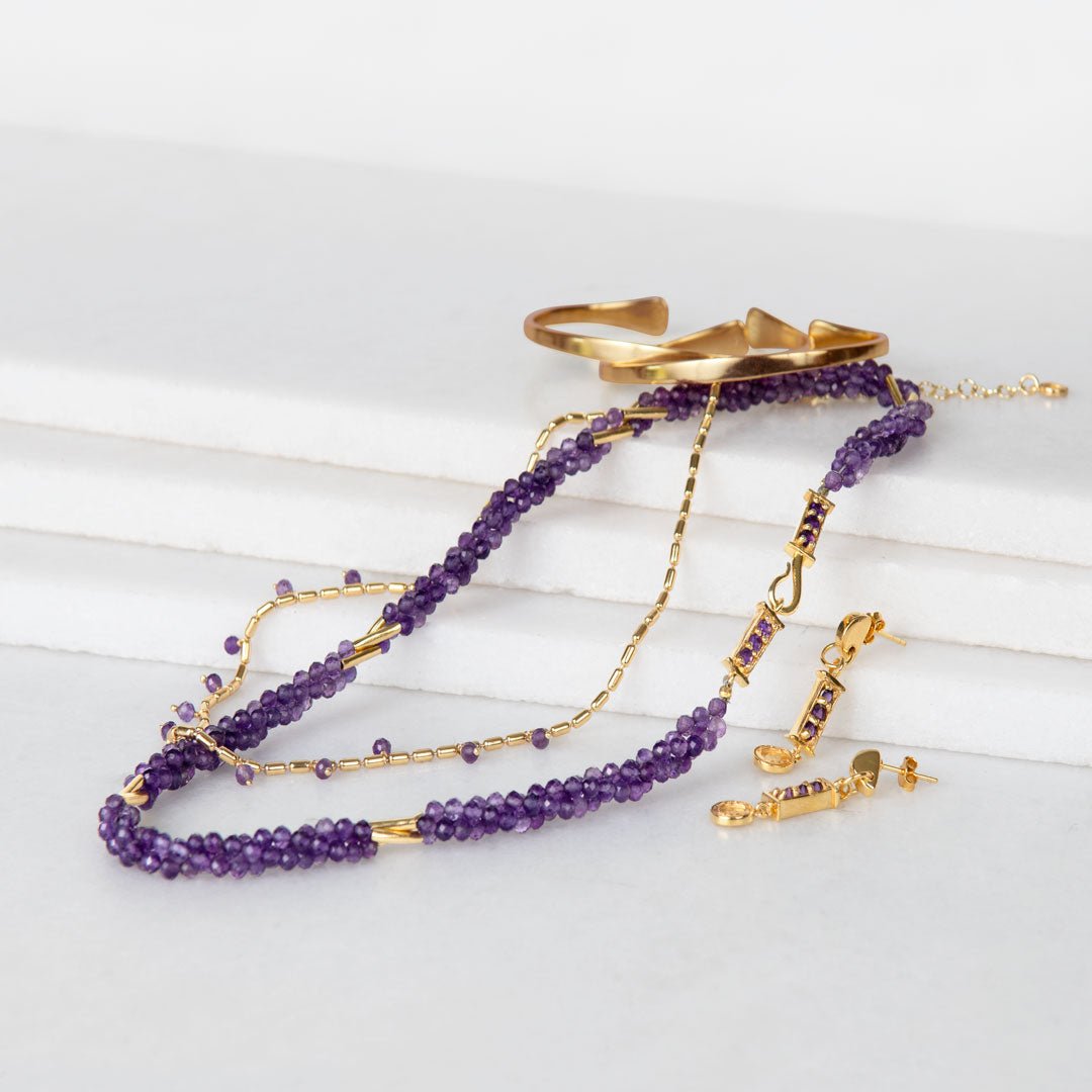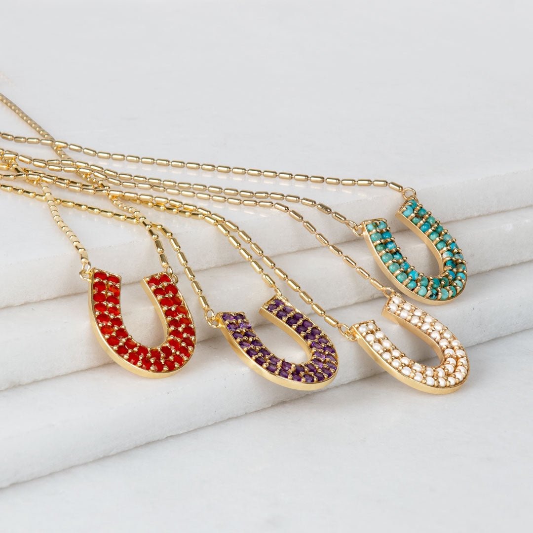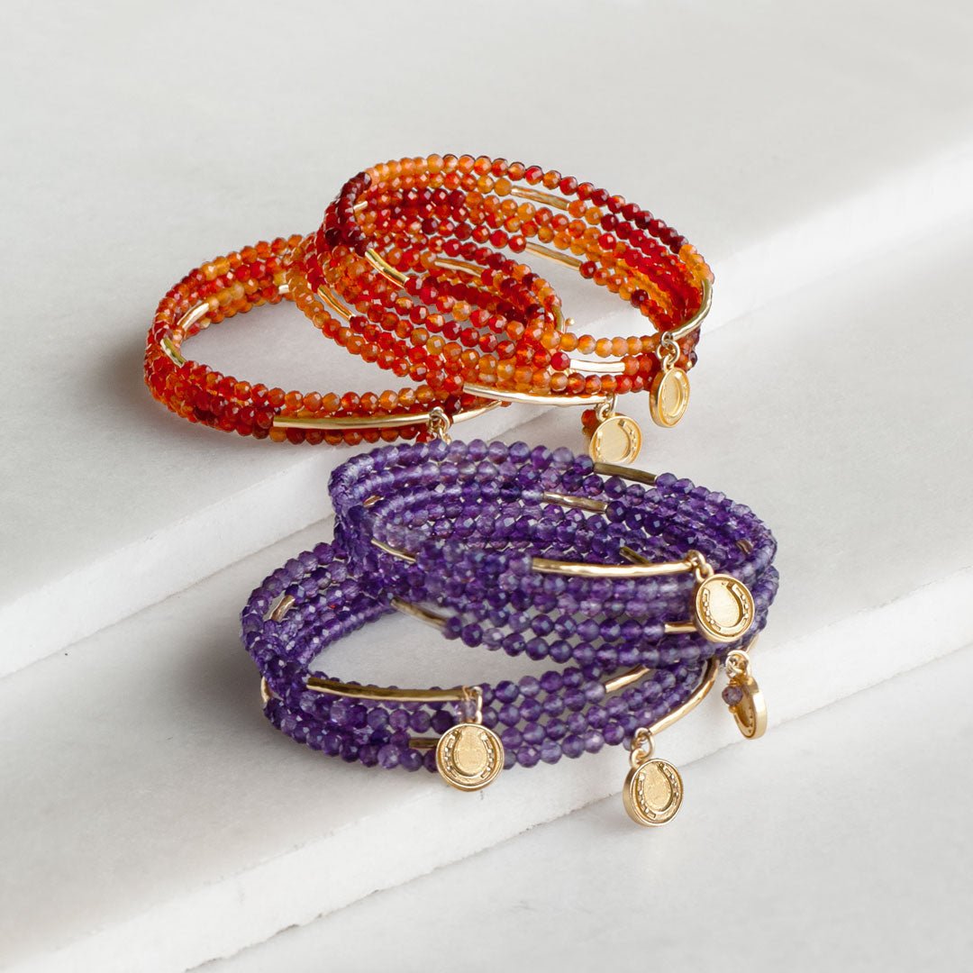 The Prism Amethyst Horseshoe Coin Earrings by URBAN-EQUESTRIAN bring gemstone elegance to classic equestrian jewelry. Amethyst, treasured for balance, calm, and spiritual clarity, glows with violet brilliance in radiant coin drops framed by iconic horseshoe detail. Lightweight yet striking, these horseshoe earrings add refined sparkle from Gallop to Gala! A chic horse girl accessory and meaningful horse lover gift for everyday or soirée style.