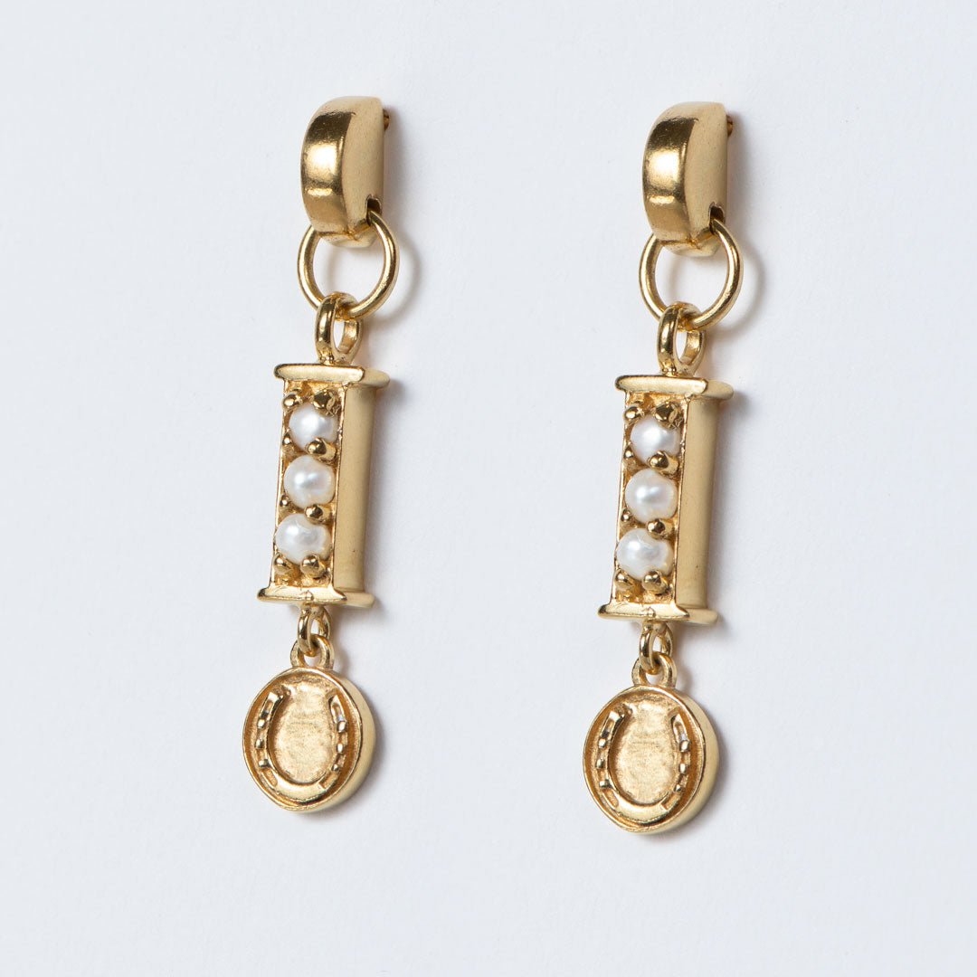 The Linea Pearl Equestrian Earrings by URBAN-EQUESTRIAN blend modern design with timeless equestrian jewelry elegance. Crafted in sleek linear form, each earring is accented with luminous pearl, long valued as a symbol of purity, wisdom, and grace. Lightweight and versatile, they transition effortlessly from Barn to Brunch, adding polished refinement to any look. A sophisticated horse girl accessory and elegant horse lover gift.