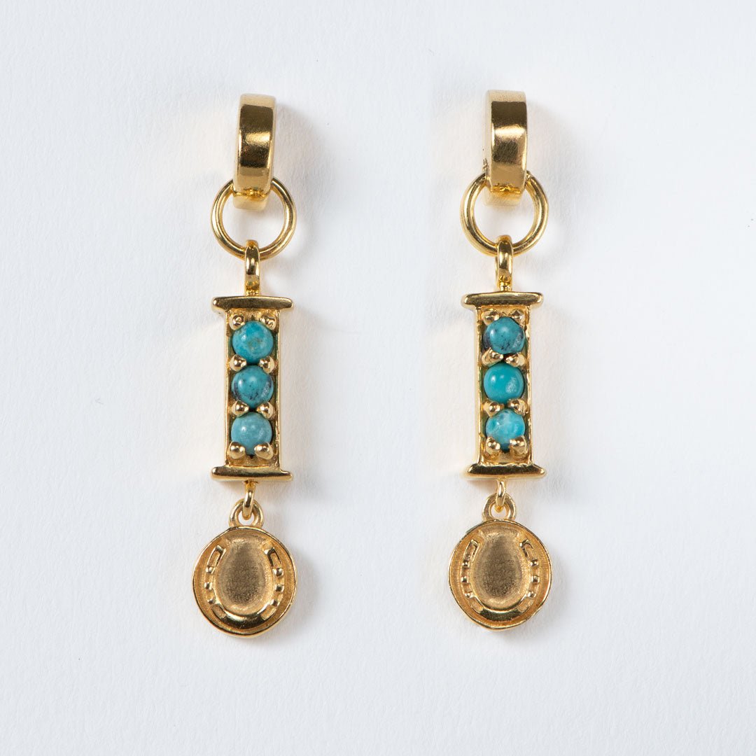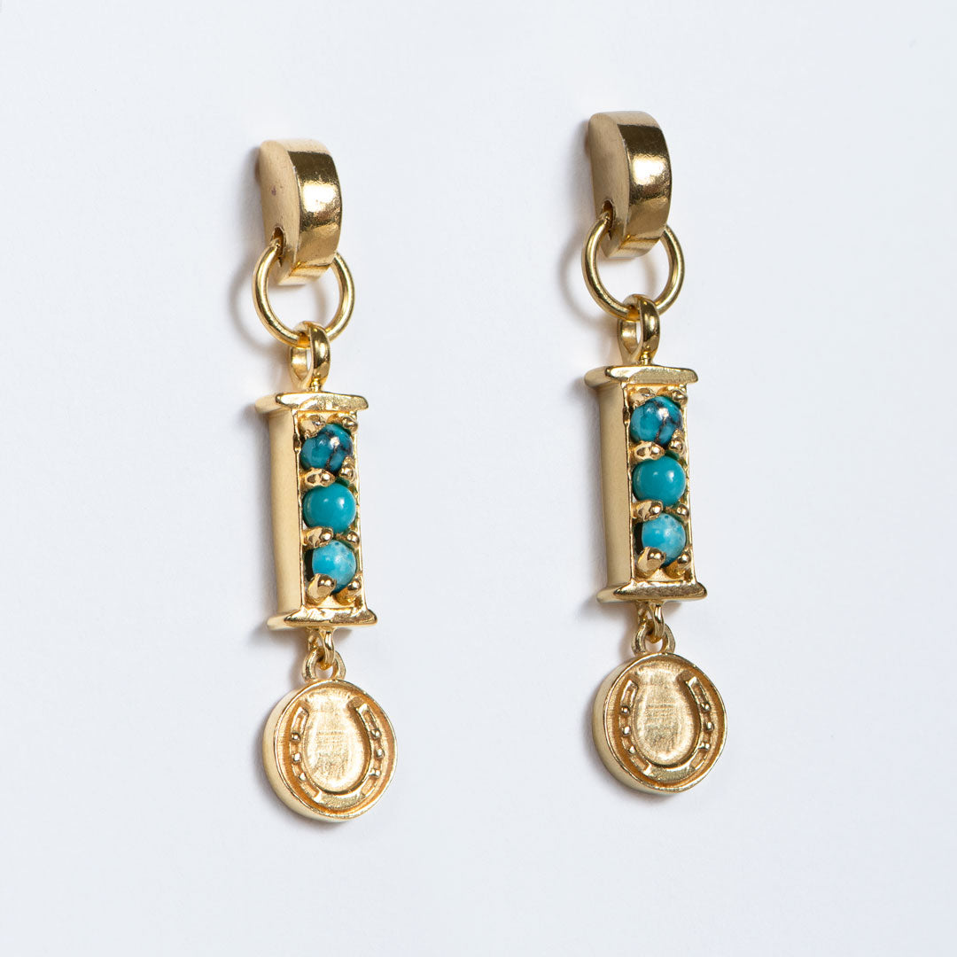 The Prism Turquoise Horseshoe Coin Earrings by URBAN-EQUESTRIAN capture vibrant spirit and bold equestrian style. Long treasured as a stone of protection, strength, and good fortune, turquoise radiates with striking blue-green color. Set in radiant coin drops with iconic horseshoe detail, these earrings are lightweight yet full of presence. From Rodeo to Runway, they’re a chic horse girl accessory and meaningful horse lover gift.