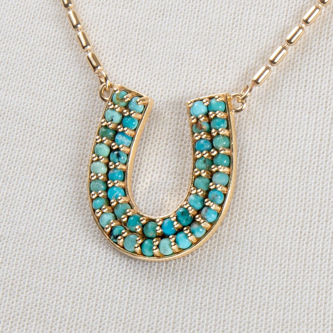 From Rodeo to Runway, the Turquoise Equestrian Horseshoe Necklace by URBAN-EQUESTRIAN brings vibrant energy and equestrian elegance. Turquoise, treasured as a stone of protection, strength, and good fortune, glows with a striking blue-green hue. Framed in the classic horseshoe pendant, it merges refined equestrian jewelry with gemstone tradition. A bold horse girl necklace and meaningful horse lover gift, perfect for daytime or evening style.