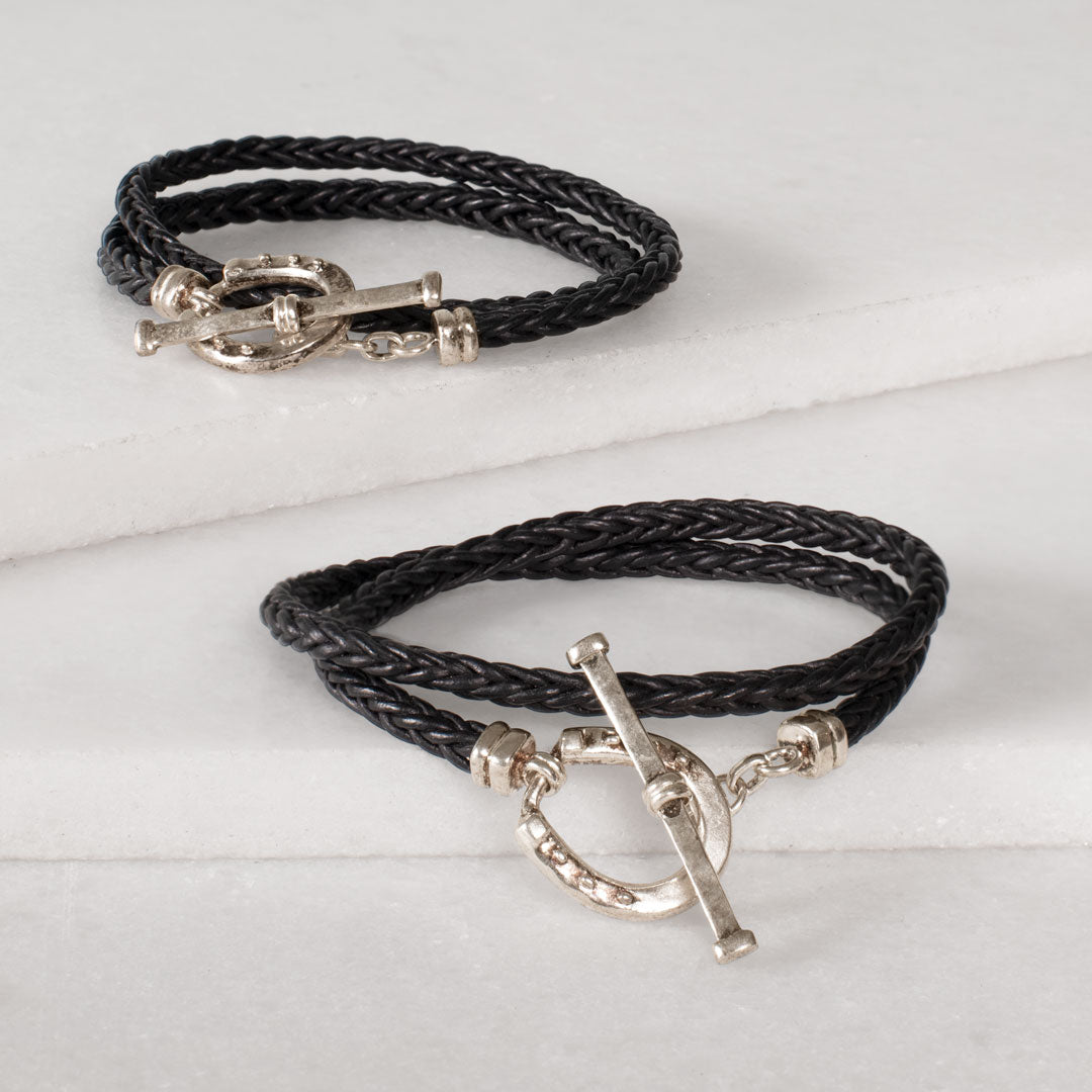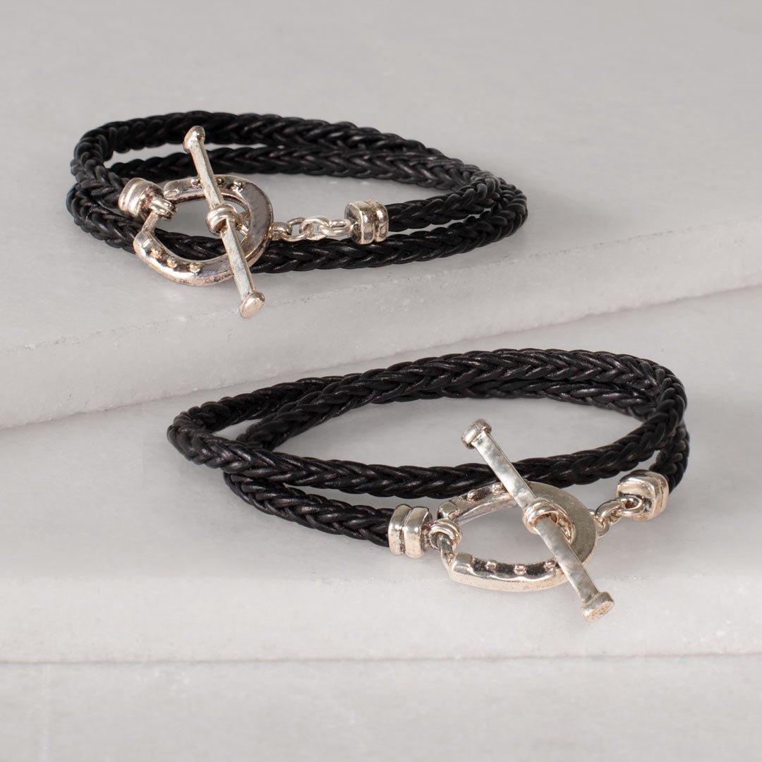 Roundup - Braided Leather Horseshoe Bracelet in Black & Silver