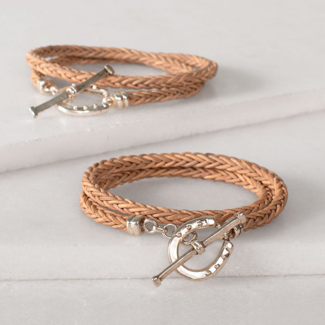 Roundup - Braided Leather Horseshoe Bracelet in Natural & Silver