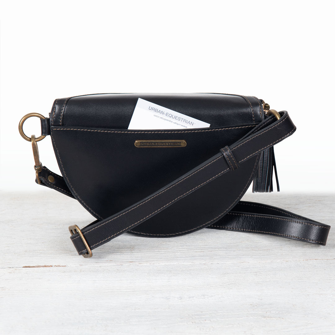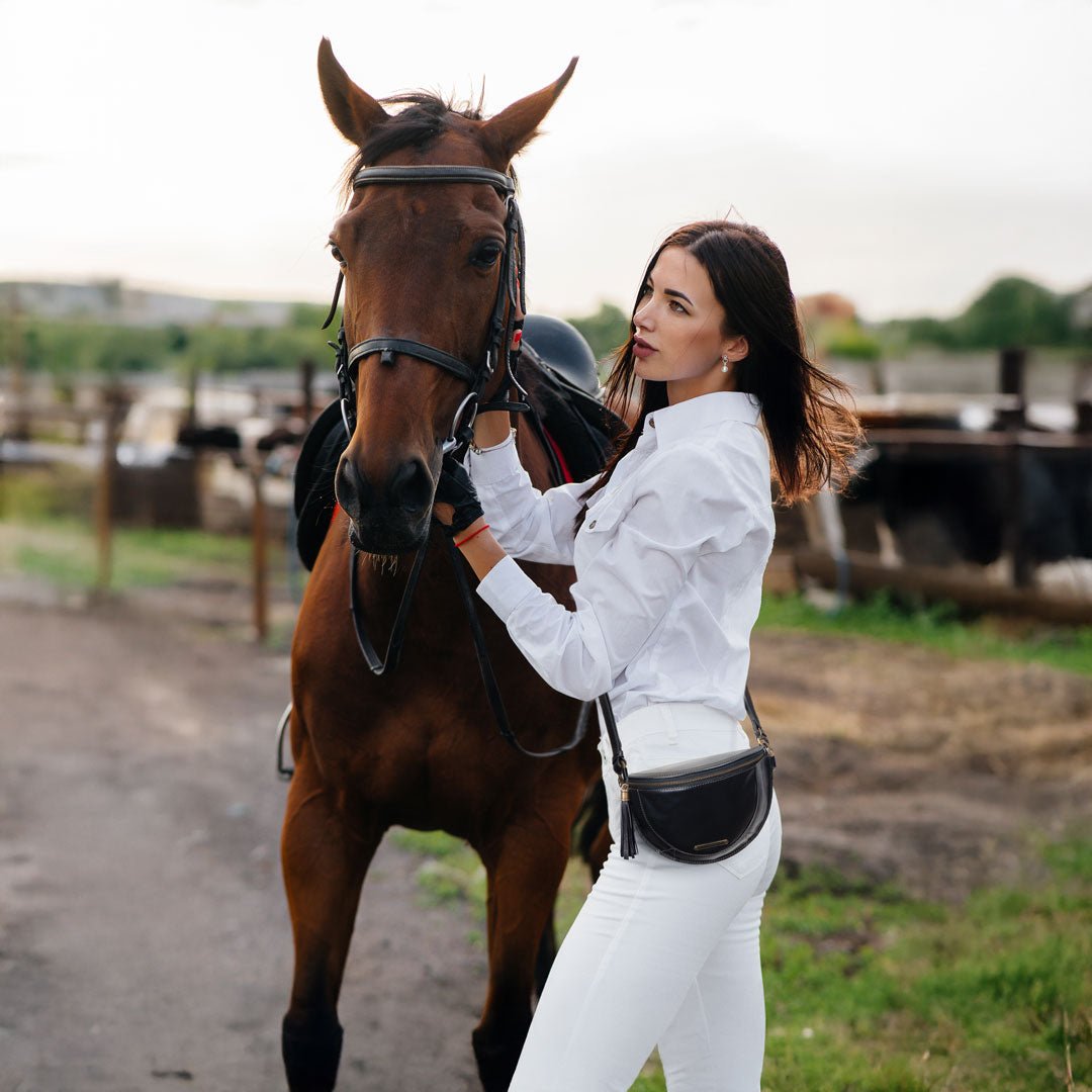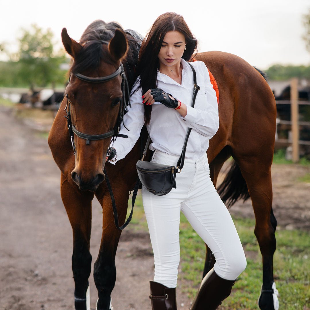 From Stable to Street, the Sonoma Sling Bag in Black Italian Leather by Urban-Equestrian brings effortless EQ sophistication for horse girls and fashionistas alike. Crafted in supple Italian leather with gleaming brass hardware, this sleek, body-hugging sling is a standout horse lover gift. With an adjustable strap, secure zip, and smart interior pockets, it’s the perfect equestrian-inspired everyday essential.